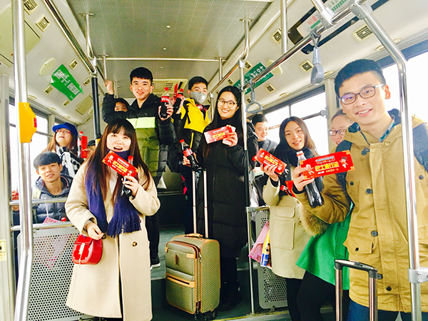 2017年1月13日“春運大潮”正式開始,第一波主流人群就是學生,除了搶車票,擠候車廳,還有前奏就是擠公交,搶出租車去車站。為了讓同學們更順利的回家,可口可樂在鄭州5所高校打造了愛心專列巴士,持續(xù)5天往返于車站和學校之間,助力按時抵達。“還有什么比回家更開心的嗎?還有什么比,邊喝可口可樂邊看別人擠公交車更開心的嗎?愛心巴士好贊,讓我們的歸家路無比快樂和暖心!” 河南輕工業(yè)大學大三耿嘉尉同學高興的說著。