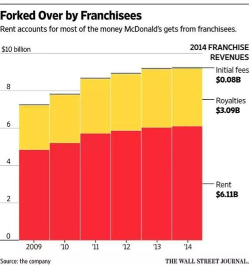 這是雷·克羅克在早期設(shè)計麥當(dāng)勞的特許經(jīng)營模式時,就留下的一個獨到之處:為了加強控制權(quán),所有門店所需要的土地物業(yè),都要由麥當(dāng)勞總部出面收購,再轉(zhuǎn)租給特許經(jīng)營商,每年按略低于市場價的水平收購租金。在房地產(chǎn)市場節(jié)節(jié)攀升時,租金收入會水漲船高;而一旦特許經(jīng)營商表現(xiàn)欠佳,也可以隨時將他們“掃地出門”。一些持有麥當(dāng)勞股票的對沖基金經(jīng)理們甚至曾經(jīng)想過,把麥當(dāng)勞的餐飲和房地產(chǎn)業(yè)務(wù)拆分成兩部分,以便更有效地管理資產(chǎn)。