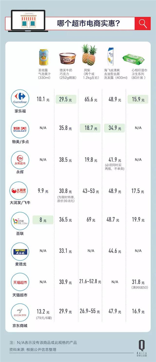 值得指出的是,除了麥德龍和物美承諾“線上線下統(tǒng)一價(jià)格”之外,其他幾家的門(mén)店和電商都不能保證一致的價(jià)格。