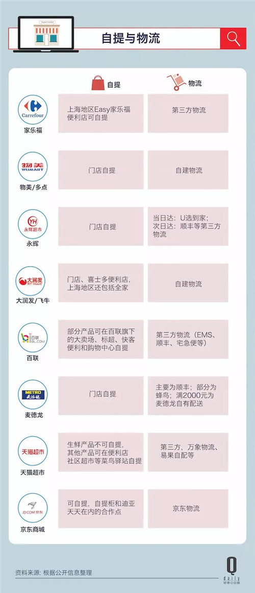 超市有線下門(mén)店這些據(jù)點(diǎn)優(yōu)勢(shì),大部分超市電商都不會(huì)漏過(guò)自提的功能。除了網(wǎng)上家樂(lè)福只能在便利店“家樂(lè)福 Easy”提貨之外(你暫時(shí)還不能在家樂(lè)福超市門(mén)店提貨),其實(shí)都是希望把客流引向線下門(mén)店。大潤(rùn)發(fā)/飛牛的自提點(diǎn)更多,除了大潤(rùn)發(fā)還有同一母公司高鑫零售旗下的喜士多,在上海它還和全家便利店建立合作,消費(fèi)者也可以在那里自提。