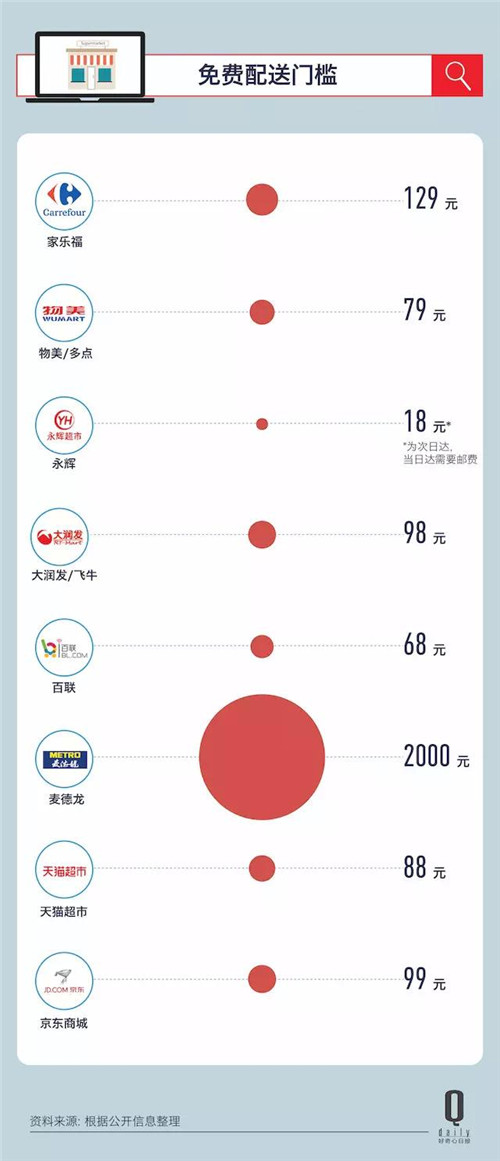 另外一個(gè)問(wèn)題是生鮮免費(fèi)配送門(mén)檻比較高(和普通商品同價(jià))。比如,百聯(lián)需要 68 元,飛牛需要 98 元。其實(shí),包括更成熟的天貓超市和京東也有類似的問(wèn)題,分別需要滿 88 元和 99 元才能免郵費(fèi),生鮮電商天天果園的包郵門(mén)檻也要 68 元。