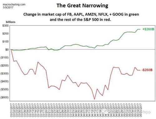 在美國同樣的事情也在發(fā)生:蘋果,微軟,亞馬遜,F(xiàn)acebook和谷歌這五只股票的漲幅占到今年標普500的13%,以及納斯達克100的42%。下面這張圖非常有趣:從今年3月1日到5月9日,美國科技股的這五大天王市值增長了2600億美元,而其他標普500的公司市值縮小了2600億美元。