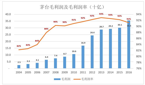 2016年,貴州茅臺(tái)毛利潤(rùn)355億,同比增長(zhǎng)17.7%。