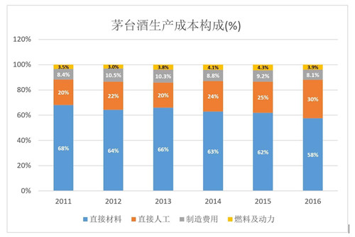 茅臺(tái)酒的生產(chǎn)成本包括原材料、人工、制造費(fèi)用、燃料及動(dòng)力四個(gè)部分。2011-2016年,直接材料占比從68%降至58%,直接人工占比則由20%增至30%。