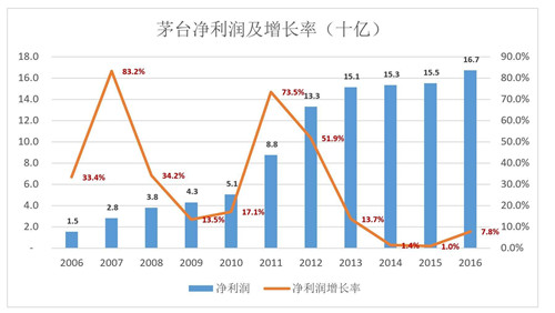 2006-2016年,茅臺(tái)營(yíng)收平均年復(fù)合增長(zhǎng)率為26.9%。但最近3年,凈利潤(rùn)同比增幅都是“個(gè)位數(shù)”:1.4%、1.0%、7.8%……