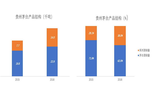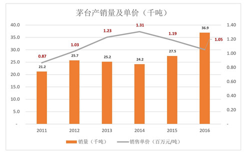 2016年,貴州茅臺(tái)產(chǎn)量、銷(xiāo)量創(chuàng)紀(jì)錄地達(dá)到5.99萬(wàn)噸和3.69萬(wàn)噸,單價(jià)則進(jìn)一步滑落到105萬(wàn)元/噸。不是因?yàn)槊┡_(tái)降價(jià),而是產(chǎn)品結(jié)構(gòu)發(fā)行了變化。