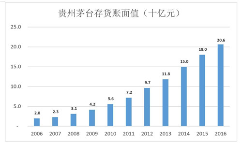2005-2016年,貴州茅臺(tái)存貨賬面值年均復(fù)合增長(zhǎng)率達(dá)24.4%,幾乎是產(chǎn)能擴(kuò)張速度的一倍。