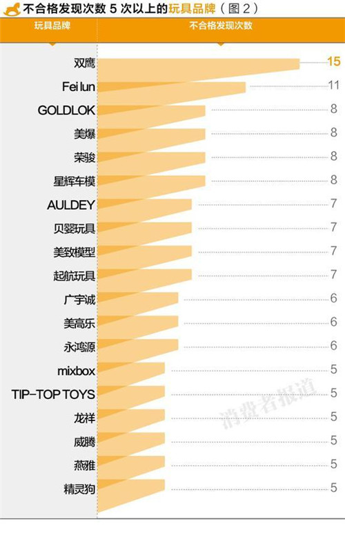 雙鷹與飛輪的不合格次數(shù)超過10次,而美高樂、星輝車模等較知名品牌也數(shù)次登上黑榜。兒童玩具的抽檢不合格項目主要集中在標志與危險警示不規(guī)范、以及小零件、尖端傷害等方面。