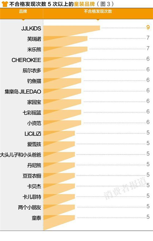 數(shù)據(jù)分析顯示,由郭濤父子代言的有30年創(chuàng)立歷史的季季樂(JJLKIDS)童裝的不合格發(fā)現(xiàn)次數(shù)竟高達9次。而兒童與嬰幼兒服飾的不合格項目集中在標識、纖維含量、pH值、使用說明等方面。