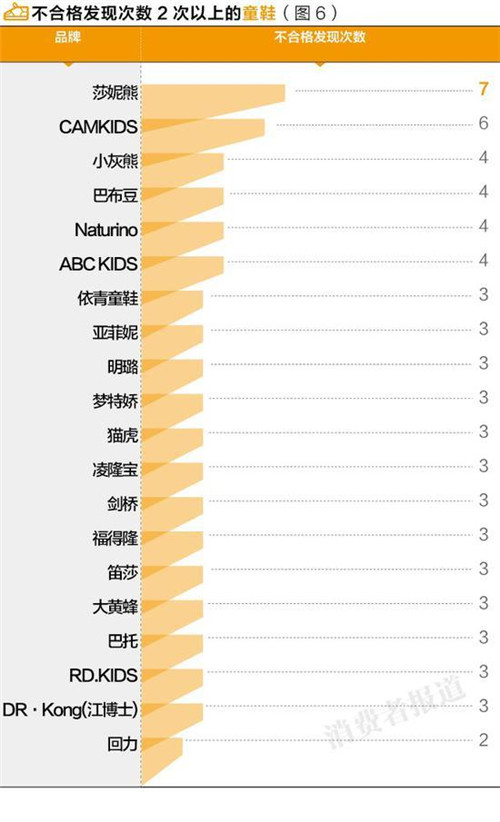 抽檢數(shù)據(jù)顯示,上海童鞋品牌莎妮熊的的不合格次數(shù)最高,而童鞋抽檢不合格的,回力也有兩次出現(xiàn)不合格。主要問題集中在強度硬度、標識、感官質(zhì)量、高度(長度)誤差等方面。
