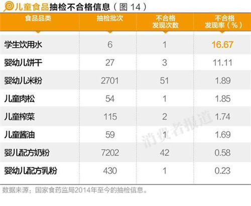 《消費者報道》通過梳理國家食藥監(jiān)局2014年以來的12551條兒童食品抽檢數(shù)據(jù)發(fā)現(xiàn),兒童食品的合格率較高,達99%,而不合格品牌也是較為小眾品牌。本刊提醒消費者謹慎購買奶粉不合格次數(shù)較多的幾個品牌,如雅因樂、冠爾優(yōu)等。