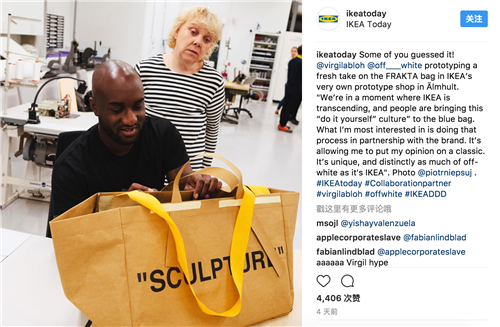 宜家宣布合作的同時,還在其官方ins上面貼出了 Off-White 創(chuàng)始人兼創(chuàng)意總監(jiān) Virgil Abloh 設計的聯(lián)名 FRAKTA 購物袋,包的一側(cè)還寫著“sculpture”。