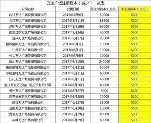 2017年5月9日至6月29日,全國19家萬達(dá)商業(yè)項(xiàng)目公司——各地的萬達(dá)廣場投資公司集中進(jìn)行了減資,注冊資本金由原先最高24億元,最低9000萬元,統(tǒng)一減至5000萬元。