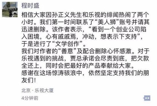 程時(shí)盛在朋友圈中寫(xiě)到:相信大家因?qū)O正義先生和樂(lè)視的緋聞熱鬧了兩個(gè)小時(shí)。我們第一時(shí)間聯(lián)系了“美人獅”賬號(hào)并請(qǐng)其迅速刪除。該作者表示,“看到一個(gè)創(chuàng)業(yè)公司陷入困境,心有戚戚焉,沖動(dòng),想表示下支持”,于是進(jìn)行了“文學(xué)創(chuàng)作”。我們對(duì)作者的“善意”及配合刪除心懷感激。對(duì)于樂(lè)視遇到的挑戰(zhàn),賈總承諾會(huì)盡責(zé)到底,把欠款全還上,同時(shí)會(huì)把最好的產(chǎn)品奉獻(xiàn)給大家。感謝在這場(chǎng)驚濤駭浪中,依然堅(jiān)定支持我們的朋友們!