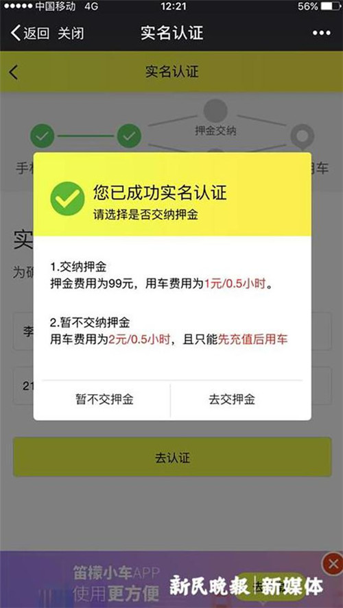 這輛黃色小車車身上貼有二維碼,并寫著“掃碼一元用車”,右側(cè)后輪安裝有四位密碼鎖。小新嘗試掃碼,跟共享單車注冊流程相似,需要手機注冊和實名認證。實名認證后,則可選擇是否交納押金,按提示說明,兩者在后續(xù)使用費用上存在差異,交納99元押金后的使用價格便宜一些,半小時1元。