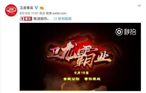 6月14日消息,衛(wèi)龍辣條也要跨界出手游了。衛(wèi)龍食品官微曝光了一則預(yù)告短片,表示將于6月15日公測(cè)一款名叫《衛(wèi)龍霸業(yè)》的手游。
