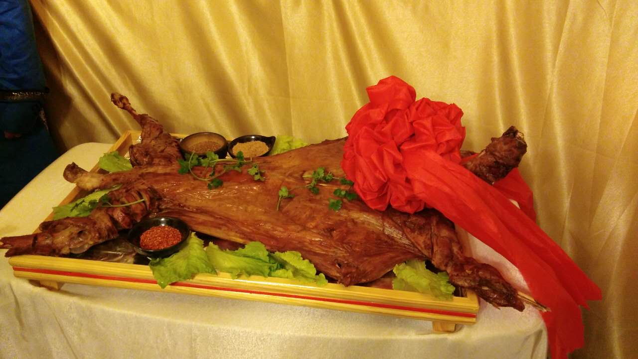 只一道烤全羊,酒店大廚都頗費工夫。食材精選肉質(zhì)鮮嫩的鮮羊,肉質(zhì)均勻。因為對“原汁原味”的極致追求,整只羊需提前三個小時炭火慢慢烤制。烤全羊上席后,色澤金黃,表皮脆嫩,鮮香襲人,令人垂涎欲滴。此時,酒店工作人員會為當(dāng)晚最尊貴的客人獻上哈達,并邀請客人一起舉行“開羊儀式”,在蒙古,這象征主人對朋友最誠摯的祝福。