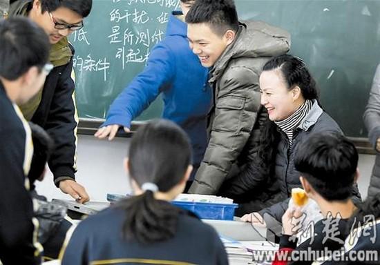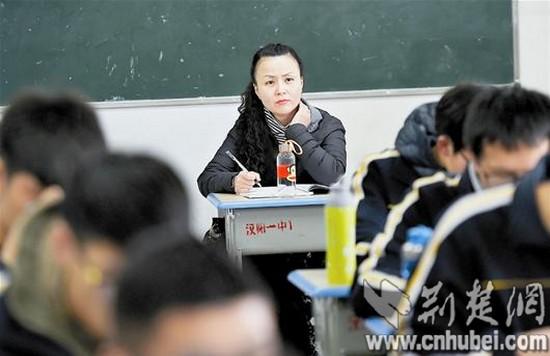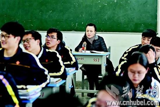 9日上午10時30分許,記者首先來到漢陽一中高二(15)班。這是一堂歷史課,老師講得神采飛揚,同學(xué)們聽得津津有味。教室最后一排坐著一位中年女士,時而認(rèn)真聽講,時而埋頭記筆記。
