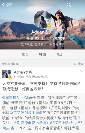 那么,《情劍》的兩位“主演”謝霆鋒與鐘欣桐為什么沒來宣傳本片呢?馬云對此表示:“兩位演員都還有別的戲要拍,沒時間來宣傳我們的電影?!钡皫兹崭勖絾柤傲藘扇说慕?jīng)紀(jì)人霍汶希,對方稱《情劍》片方根本沒有通知他們上映的事,更沒有邀請二人宣傳。而在微博上認證為“香港演員、謝霆鋒助手”的網(wǎng)友“Adrian表哥”也發(fā)微博指責(zé)片方并沒有得到謝霆鋒的同意,是奸商行為。另外,記者也查閱了《情劍》的官方微博,該官微在開辦至今僅發(fā)7條微博,有90個粉絲。可以說,《情劍》除了一組有“抄襲嫌疑”的海報之外幾乎是在沒有任何宣傳的情況下推進院線的。