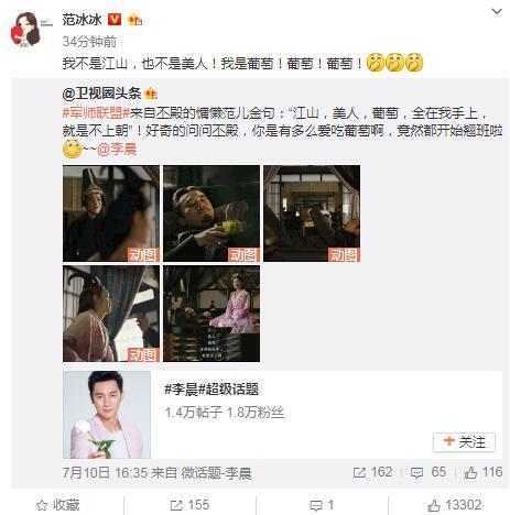 范冰冰看到后,轉(zhuǎn)發(fā)這條微博,還稱(chēng)自己不是江山、也不是美人,只是一顆葡萄,緊接著一連四個(gè)感嘆號(hào),把自己比作李晨愛(ài)吃的葡萄,不少網(wǎng)友看到覺(jué)得驚呆了,范爺也變得有點(diǎn)污。