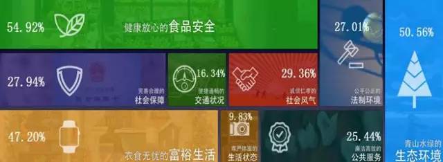 重視“舌尖上的安全”,提到“全面小康社會(huì)”最期待的圖景,“健康放心的食品安全”(54.92%)最被百姓看重。其次,山青水綠的生態(tài)環(huán)境(50.56%)和衣食無憂的富裕生活(47.20%)也很重要。