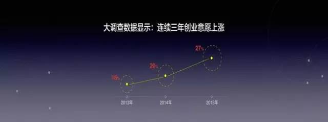 面向2016年,有創(chuàng)業(yè)意愿的受訪者比例高達(dá)27%,創(chuàng)業(yè)意愿連年攀升,“大眾創(chuàng)業(yè)、萬眾創(chuàng)新”熱潮在持續(xù)發(fā)酵。