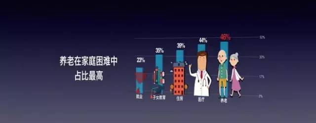 養(yǎng)老(46.6%)替代住房,與收入(54.8%)和醫(yī)療(45.3%)共同成為民生的三大困難。其次是住房、子女教育、就業(yè)和婚姻狀況等問題。