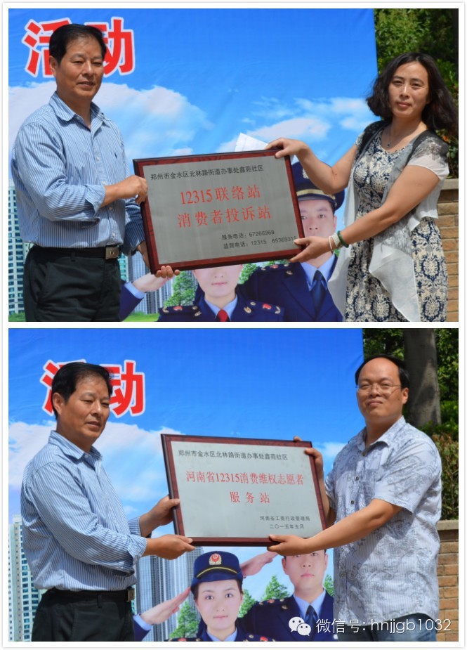 活動現(xiàn)場,省工商局趙中祥副局長還向鑫苑社區(qū)頒發(fā)了“12315聯(lián)絡站、投訴站”、“消費維權(quán)志愿者服務站”牌匾。