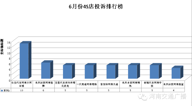 應(yīng)廣大聽眾要求,本次排行榜首次公布了汽車4S店投訴排行,分別是:長(zhǎng)安汽車河南大河車城、東風(fēng)標(biāo)致河南恒獅4S店、五菱汽車鄭州市豫北機(jī)電、一汽奧迪河南豫海4S店、菲亞特河南凡迪4S店、東風(fēng)本田河南錦鴻4S店、奇瑞汽車河南中值4S店、東風(fēng)標(biāo)致河南鼎星4S店。