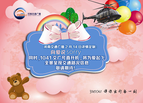 2月14日當天,1041交廣號直升機也將再次為愛起飛,在全景呈現(xiàn)路況信息的同時,為您提供情人節(jié)私人定制飛行。如果你足夠幸運,將有機會坐上1041交廣號直升機,和你的那個Ta獨享二人世界,遨游藍天、一起俯瞰鄭州美景。