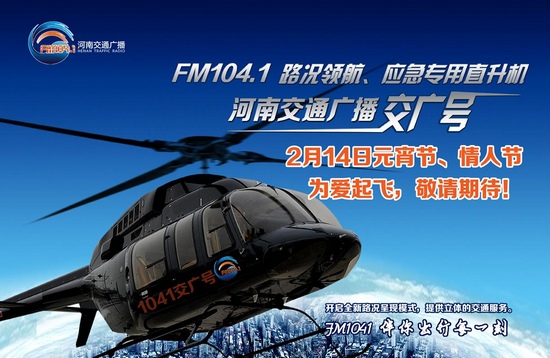 2月14日,河南交通廣播將送來“中西合璧情人節(jié)”重磅大禮——“向愛說sorry”交廣號(hào)私人定制浪漫情人節(jié)。當(dāng)天,1041交廣號(hào)直升機(jī)將再次為愛起飛,全景呈現(xiàn)省會(huì)鄭州交通路況,并聯(lián)合二七萬(wàn)達(dá)廣場(chǎng),提供情人節(jié)私人專機(jī)浪漫飛行,現(xiàn)在參與河南交通廣播節(jié)目微信互動(dòng),就有機(jī)會(huì)和你的TA坐上1041交廣號(hào)專機(jī),獨(dú)享二人世界,不妨來一場(chǎng)浪漫的空中求婚儀式。