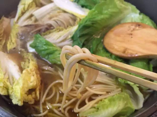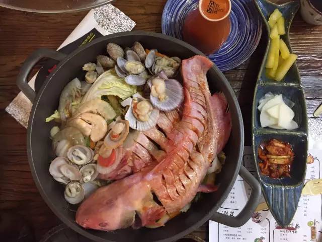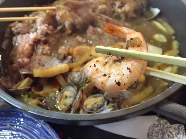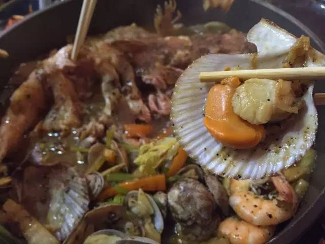 以魚(yú)、扇貝、大蝦和時(shí)蔬為鍋底,先燜制,后以米酒澆鍋,點(diǎn)火后,能看到火焰在食材上跳躍,聞到淡淡的酒香,最后的醬料可以拌意面吃,有黑椒、麻辣和酸菜三種口味。