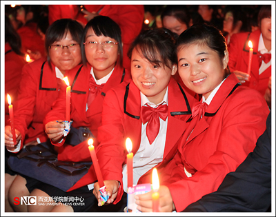 金秋九月,在同學(xué)們的陣陣掌聲與歡呼聲中,2012教育廣播——西亞斯迎新燭光晚會(huì)拉開帷幕。晚會(huì)一開始,首先由大四學(xué)生代表將象征著西亞斯精神的火炬依次傳遞給低年級(jí)同學(xué),最終傳遞至大一新生手中,并以此點(diǎn)燃全校師生手中的蠟燭來照亮整個(gè)天空。面對(duì)這樣的迎新晚會(huì),大一新生們顯得非常激動(dòng)。