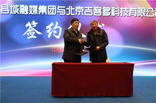 ▲河南電視臺新農(nóng)村頻道張克宣總監(jiān)與北京吉客多科技有限公司總經(jīng)理周宏志進(jìn)行簽約