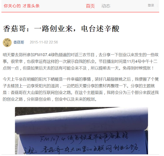 自媒體,以“香菇哥”的名義在各個(gè)自媒體平臺(tái)申請(qǐng)入駐,最先申請(qǐng)的是搜狐媒體平臺(tái),運(yùn)作的這幾個(gè)月,搜狐上的累計(jì)閱讀量目前已達(dá)到16萬(wàn)。后來(lái)又申請(qǐng)了今日頭條,一點(diǎn)咨詢,鳳凰新聞媒體平臺(tái)等渠道。也建立了自己的微信公眾號(hào)。目前所有的宣傳渠道的累計(jì)閱讀量已經(jīng)突破了七十萬(wàn)。就是在這些渠道上宣傳自己的創(chuàng)業(yè)故事以及大山里面的人文風(fēng)情來(lái)傳播。
