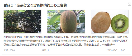 通過(guò)這些文章的傳播,我認(rèn)識(shí)到了很多的朋友,這些朋友也給我提供了很多的幫助,通過(guò)他們我開(kāi)拓了視野,對(duì)獼猴桃有了更加深刻的了解。這些幫助都來(lái)自于這些文章的宣傳。雖然有時(shí)候晚上熬夜到凌晨的兩三點(diǎn),但是我覺(jué)得正是這份辛苦,讓我更加體會(huì)到創(chuàng)業(yè)帶來(lái)的精神上的收獲。