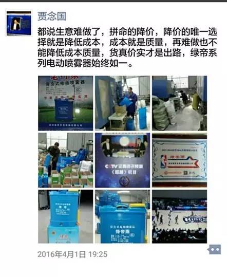 任何一名企業(yè)家,都有困惑的時候。開始的時候,生產(chǎn)電動噴霧器的公司也就只有他這一家,如今在河南省內(nèi)達到了100多家,全國的生產(chǎn)廠家有1000多家,賈總覺得目前市場競爭是比較激烈的,仿造的甚至是假冒的產(chǎn)品還時有出現(xiàn);產(chǎn)品的利潤也沒有以前高了;隨著原材料及工人工資等成本的增加,批發(fā)價格也有所調(diào)高;這一點,有時在賈總的微信里也看出了一些無奈和感慨。