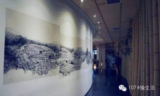 西舍乘電梯而上,卻又是另一番天地。不論是擺放在長案上,綻放的桃花,還是精致的茶具,都深深將人吸引,長長的過道用竹子裝飾,不禁讓人想到“寧可食無肉,不可居無竹”的詩句,水墨畫也被搬上墻壁,更顯得雅致和店主的巧心思。