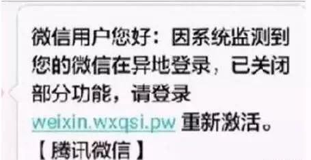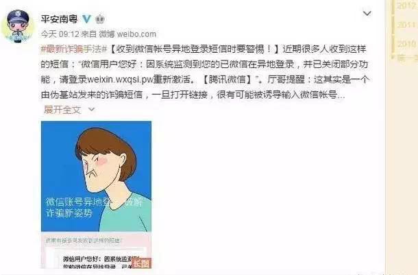 #最新詐騙手法#【收到微信帳號異地登錄短信時要警惕!】近期很多人收到這樣的短信:“微信用戶您好:因系統(tǒng)監(jiān)測到您的已微信在異地登錄,并已關閉部分功能,請登錄weixin.wxqsi.pw重新激活?!掘v訊微信】”。廳哥提醒:這其實是一個由偽基站發(fā)來的詐騙短信,一旦打開鏈接,很有可能被誘導輸入微信帳號、微信密碼、支付密碼、驗證碼等,后果不堪設想……