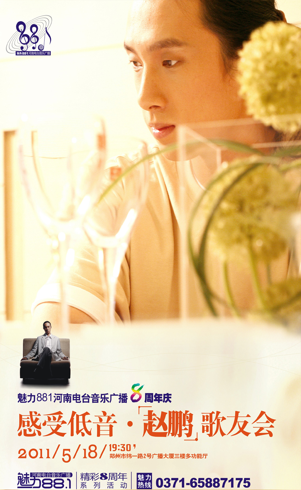 “感受低音 趙鵬歌友會”于5月18號晚7點半將在在鄭州緯一路廣播大廈三樓多功能廳舉行。如果你也想親臨現(xiàn)場,聆聽他的迷人低音嗓音。參與方式:1、成為@河南電臺-新媒體粉絲2、轉(zhuǎn)發(fā)此條微博同時@兩位好友。屆時,你就有機(jī)會贏得歌友會門票,并能親臨現(xiàn)場欣賞!