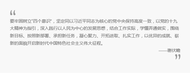 謝伏瞻說,黨的十九屆一中全會選舉習(xí)近平同志為黨的總書記,這是全黨全國各族人民的共同心愿,習(xí)近平總書記是全黨擁護、人民愛戴、當(dāng)之無愧的黨的領(lǐng)袖。大家要切實增強“四個意識”,同以習(xí)近平同志為核心的黨中央保持高度一致。中國特色社會主義進入了新時代,這是一個重大的政治判斷,為我們國家發(fā)展標明了準確的歷史坐標和發(fā)展方位。