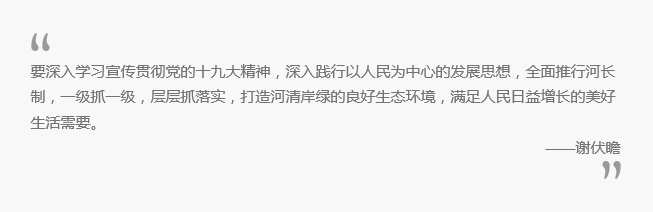 謝伏瞻指出,我們要認真學(xué)習(xí)宣傳貫徹十九大精神,按照省委省政府制定的方案,全面落實河長制,強化屬地責(zé)任,健全長效機制,細化措施辦法,嚴格追責(zé)問責(zé),保護水資源,治理水污染,修復(fù)水生態(tài)。各級領(lǐng)導(dǎo)要負責(zé),各項制度要落地,各級政府要投入,各項工作要扎實,合力攻堅,真正形成人人參與、共建共享的良好局面。