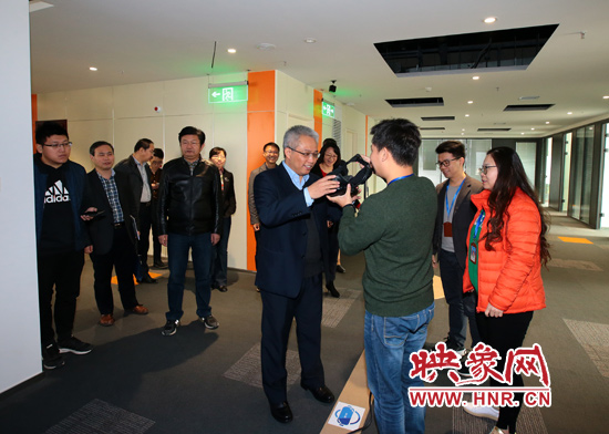 在映象網(wǎng)VR體驗(yàn)區(qū),易滌非一行還饒有興致的戴上VR眼鏡,親身體驗(yàn)了由映象網(wǎng)和河南城市VRAR研究院合作開(kāi)發(fā)的HVR互動(dòng)體驗(yàn)系統(tǒng),并對(duì)映象網(wǎng)的這一場(chǎng)景式互動(dòng)創(chuàng)新體驗(yàn)給予肯定。