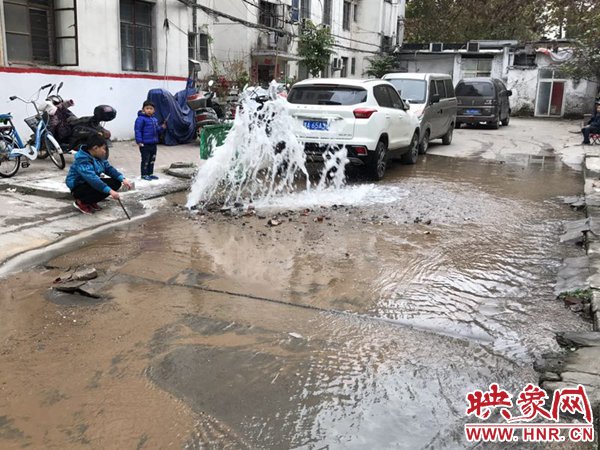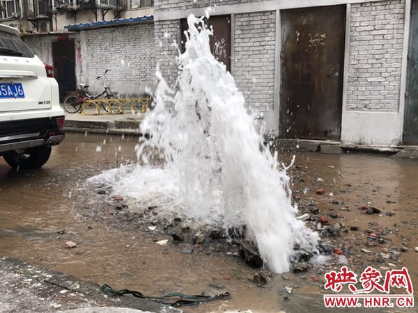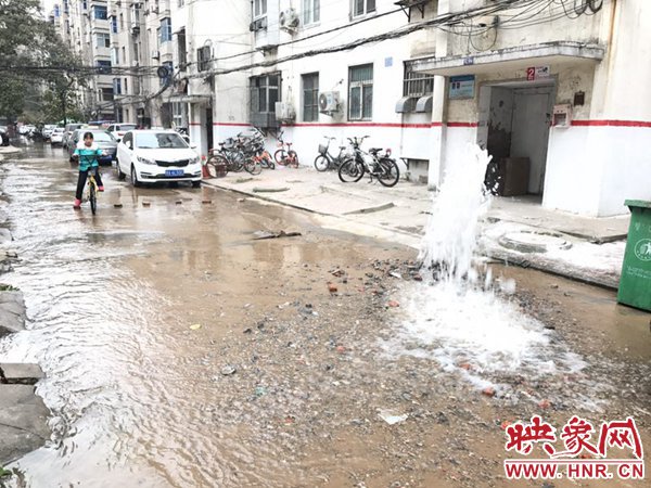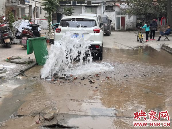 映象網(wǎng)快訊(記者 邱延波 文/圖)11月19日,鄭州桐淮小區(qū)南家屬院19號(hào)樓前,因地下自來(lái)水主管道爆管導(dǎo)致路面噴出2米多高的“噴泉”,白白浪費(fèi)掉兩三個(gè)小時(shí)的自來(lái)水。一輛轎車(chē)壓住閥門(mén)井蓋導(dǎo)致無(wú)法關(guān)閉閥門(mén),而車(chē)主在黃河邊,下午才能回來(lái),工作人員只好把小區(qū)的總閥門(mén)關(guān)閉。19日上午9時(shí)許,桐柏路汝河路口東南角處的桐淮小區(qū)南院19號(hào)樓2門(mén)洞前的自來(lái)水地下管道爆管現(xiàn)場(chǎng),小區(qū)水泥路邊爛個(gè)洞,噴出高高的水柱,小區(qū)道路上全是積水。