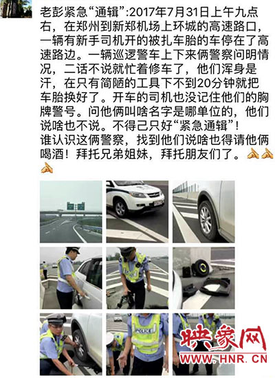 據(jù)介紹,7月31日9時許,河南省公安廳高速交警總隊一支隊執(zhí)勤民警徐玉成、余曉偉巡邏到機場高速與鄭州西南繞城高速互通處附近時,看到北向南方向一輛白色轎車停在高速路邊,上前一看車輛前輪輪胎爆胎了,司機急著去開會卻不會修車,急得滿頭大汗卻無從下手,民警了解情況后,二話沒說在酷暑高溫天氣迅速幫司機把車胎換好,司機連聲表示感謝,由于當時急著去開會,沒有來得及問出民警姓名,于是就出現(xiàn)了開頭“緊急通緝”的一幕,公司領導和員工也紛紛轉(zhuǎn)發(fā)正能量,“通緝”找人。伸手幫一把,傳遞正能量一大片。