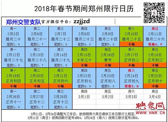 映象網(wǎng)訊(記者 秦雯)2018年春節(jié)長假從2月15日開始至2月21日結(jié)束,共7天,春節(jié)將至,為了確保在市民人流、車流、物流最密集的時段可以安全出行。2月5日,記者從鄭州市交警支隊了解到:2月15日至2月21日春節(jié)七天長假期間,鄭州市區(qū)三環(huán)以內(nèi)所有機(jī)動車尾號不限行,但2月11日(星期日)、2月24日(星期六)上班,因法定節(jié)假日放假調(diào)休而調(diào)整為上班的周六、周日,按對應(yīng)調(diào)休的工作日限行,因此2月11日(周日)按周四限行規(guī)定,限行尾號4和9;2月24日(周六)按周三限行規(guī)定,限行尾號3和8。
