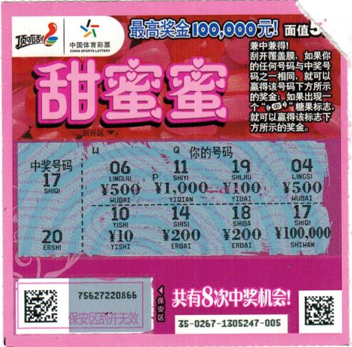 彩民王先生是一位運(yùn)動(dòng)達(dá)人,平時(shí)喜歡夜跑鍛煉身體,連續(xù)兩個(gè)星期的陰雨天終于放晴,王先生非常興奮的去夜跑,途中看到一家體育彩票店干凈整潔,明亮熱鬧。王先生發(fā)現(xiàn)很多彩民圍在桌子旁刮即開(kāi)彩票,便跟老板咨詢,當(dāng)了解到即開(kāi)彩票能即刮、即兌、當(dāng)場(chǎng)開(kāi)獎(jiǎng),就報(bào)著試試手氣的想法選了面值5元的“甜蜜蜜”彩票。滿滿的愛(ài)心,粉紅的主色調(diào)看上去很溫暖很舒服。刮著第一張的覆蓋面的最后一個(gè)號(hào)碼,王先生發(fā)現(xiàn)中獎(jiǎng)號(hào)碼區(qū)的“17”和你的號(hào)碼區(qū)的“17”完全一致,再刮開(kāi)金額100000元,哇!10萬(wàn)元頭獎(jiǎng)呈現(xiàn)眼前!一邊兌獎(jiǎng)王先生一邊激動(dòng)的說(shuō)“幸運(yùn)中大獎(jiǎng),很開(kāi)心!熱愛(ài)體育運(yùn)動(dòng),支持體育彩票!”