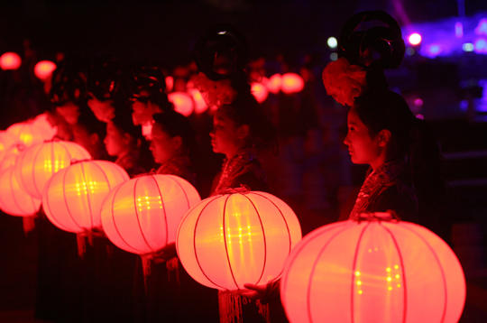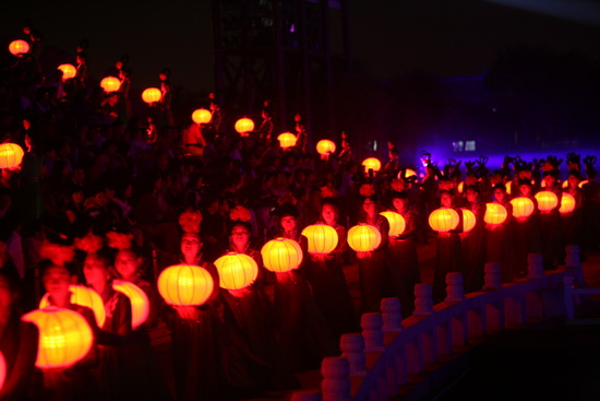 尾聲時,伴隨著一曲《水調(diào)歌頭》,寄托大家心中的美好,這時,無數(shù)盞紅色燈籠由少女們舉過頭頂,緩緩步入舞臺中央,形成一個巨大的月亮造型,柔和、寧靜,與遠(yuǎn)處的廊橋樓閣共同組成一幅壯觀的景象,令人回味悠長。