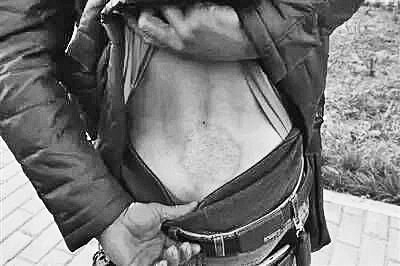 杜強掀起外衣,背上露出被煤球烤的印跡。(圖片為當(dāng)事人提供)