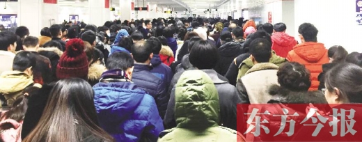 在C出入口,等待進(jìn)站的乘客隊(duì)伍長(zhǎng)達(dá)幾十米,一位剛剛通過安檢的乘客告訴記者,自己排隊(duì)的時(shí)間超過一個(gè)小時(shí)。
